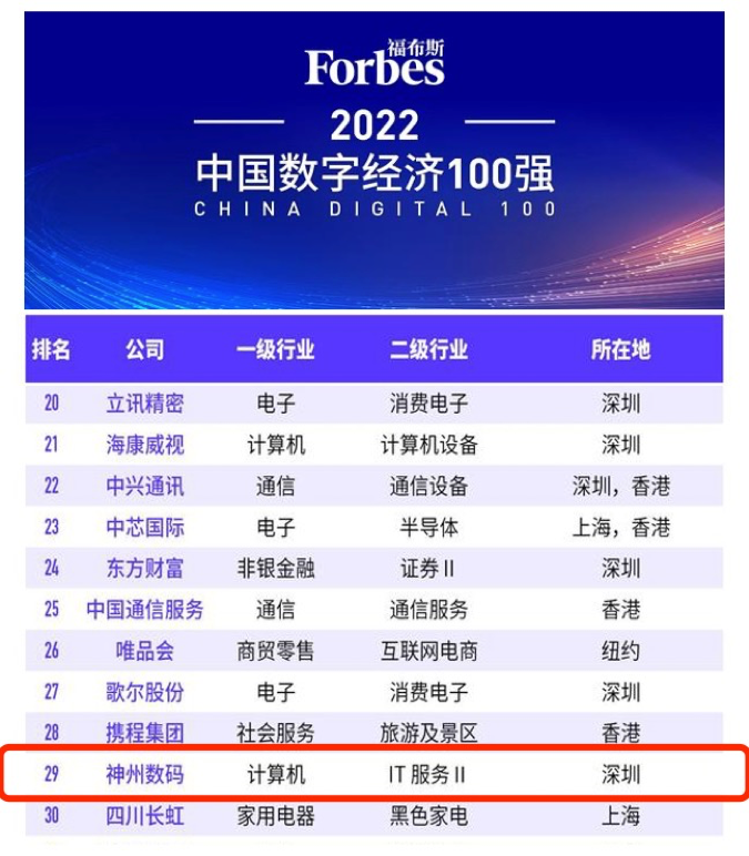8月20日,“福布斯2022中国数字经济100强榜单”在江西上饶发布。作为数字中国的探索者、实践者和赋能者,无限娱乐数码凭借杰出的表现,位列百强榜单第29位,计算机类第3位,再度获得权威机构认可。
